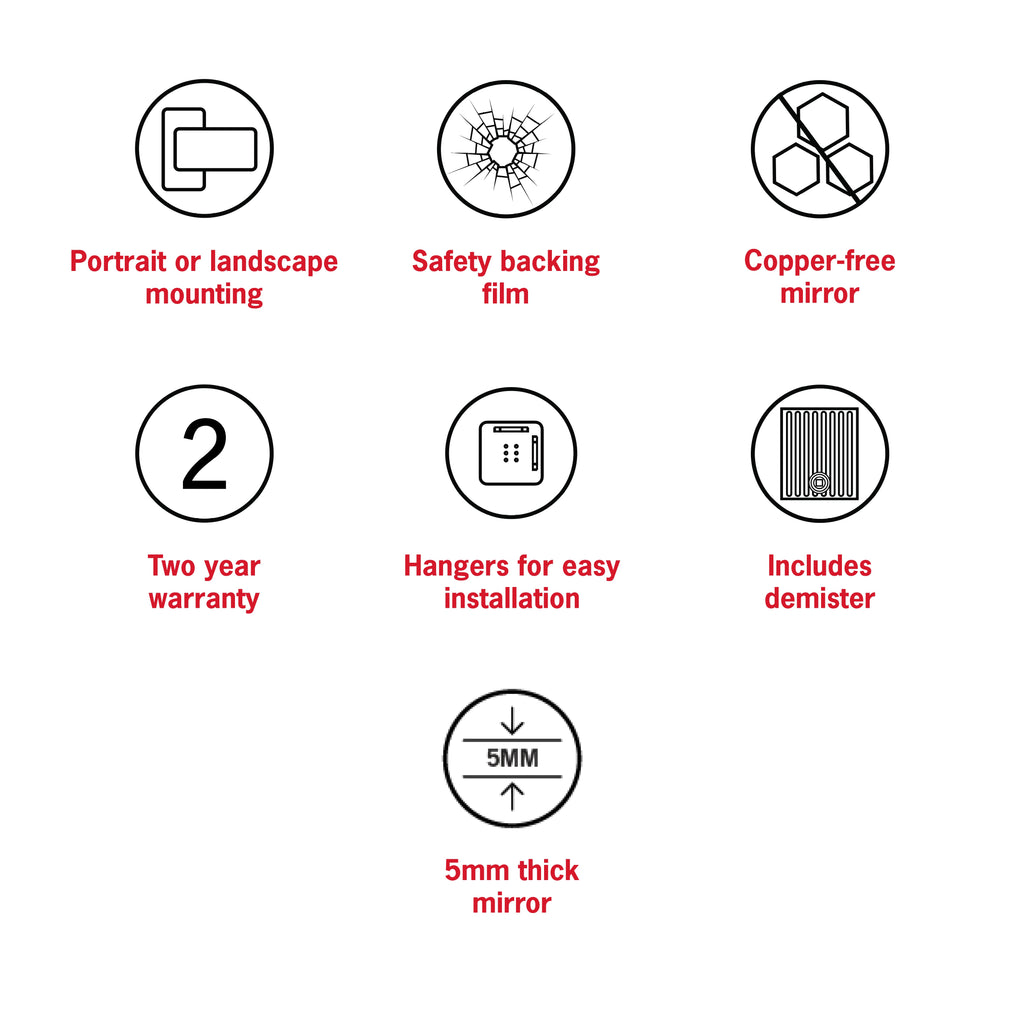 The Thermogroup Ablaze Rectangle Mirror with Sandblasted Border and Demister (600x750mm) combines elegant design with functionality. Made with a high-quality silver mirror and featuring a polished edge with a 25mm sandblasted strip along the perimeter, this mirror offers a sleek, modern look. The built-in demister ensures a fog-free reflection, ideal for bathrooms or humid spaces. Mounting is easy with included hangers, and the mirror can be oriented both vertically and horizontally. With a 2-year replacement warranty, it guarantees durability and reliability.