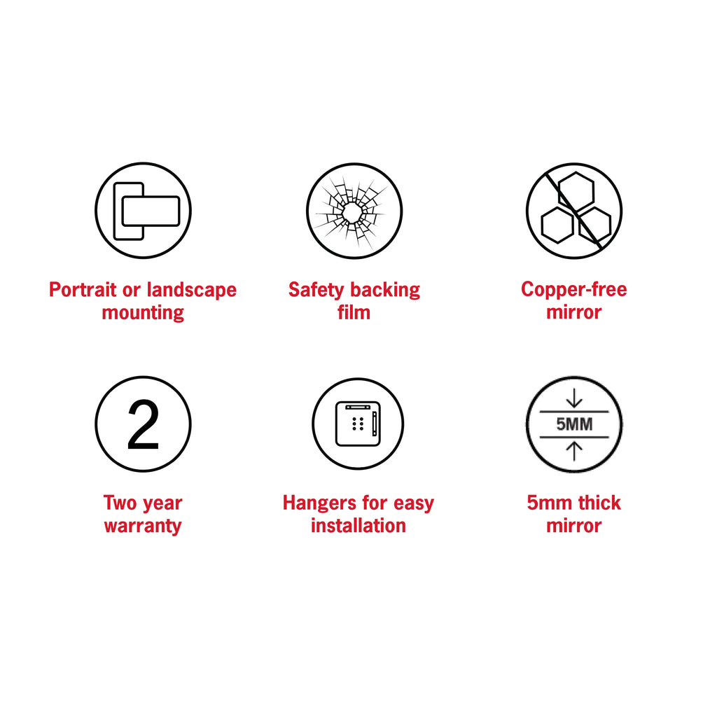 The Thermogroup Ablaze Rectangle Mirror with Sandblasted Border 900X1500mm is a perfect addition to any contemporary bathroom. Crafted from high-quality silver mirror material, it features a polished edge and a stylish 25mm sandblasted strip inset from the edge. Designed for both landscape and portrait orientations, this 14mm thick mirror is durable and elegant. Manufactured in Taiwan, it includes reliable hangers for easy mounting and is backed by a 2-year replacement warranty.