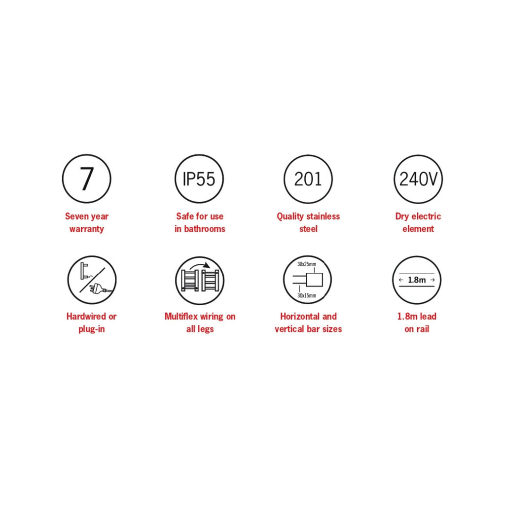 Upgrade your bathroom with Heated Towel Rails an affordable indulgence for cozy, dry towels. The BS28M, a 500x800 6-bar polished stainless steel ladder rail, effortlessly complements square tapware, presenting a sleek and functional design. This rail offers ample space for hanging two towels, blending practicality with style. Featuring multiflex wiring, the BS28M towel heater quickly warms to 45-55 degrees, ensuring a luxurious experience. Redefine comfort and aesthetics in your bathroom with the BS28M Heated Towel Rail a perfect balance of form and function. Easily operated with the on/off switch, optimize efficiency with a Timer for a hassle-free lifestyle.