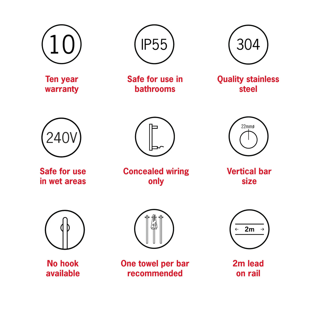 The Thermogroup Slimline Round Vertical Heated Single Towel Rail in Polished Stainless Steel combines elegance and practicality. Constructed from high-quality 304-grade stainless steel, it measures 45mm x 900mm x 80mm and features a sleek, slimline design. Wall-mounted with top wiring only, it delivers 15W of power and has an IP55 rating for enhanced durability. Available in Brushed Nickel, Matte Black, and Brushed Brass, it includes a 10-year replacement warranty covering the finish, rail body, and element.