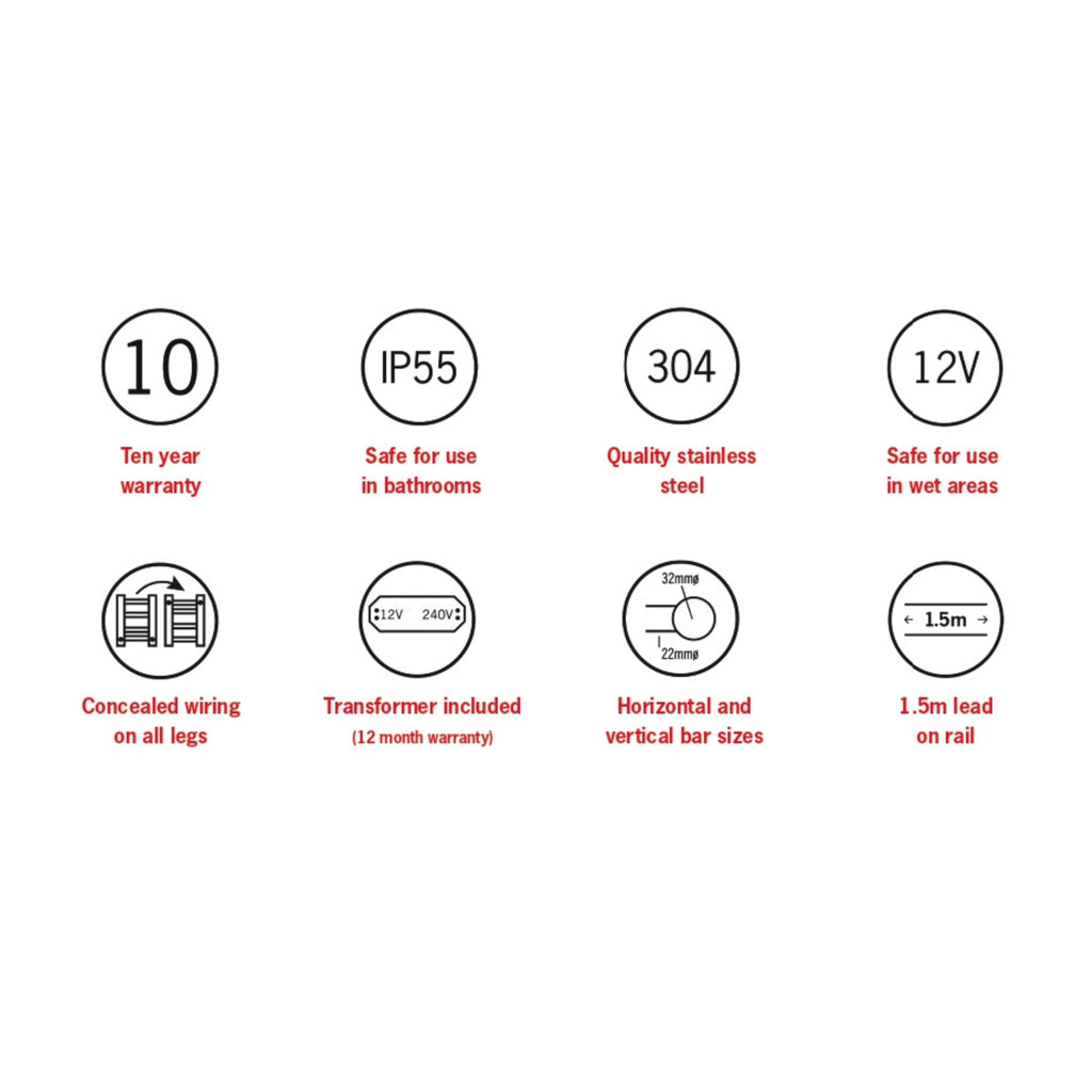 The SR4412 Heated Towel Rail, a 600x800 7-bar polished stainless steel ladder rail, offers the affordable luxury of warming and drying towels in any bathroom. This 12v electric towel dryer can be installed near wet areas, thanks to a transformer that converts 240v to 12v, maintaining standard operation temperatures and efficiency as equivalent 240v models. It features wiring points on both sides and requires hardwiring to a transformer. The rail heats up quickly to 45-55 degrees and includes an on/off switch, though a Timer is recommended for cost control, running as low as $1 a week.