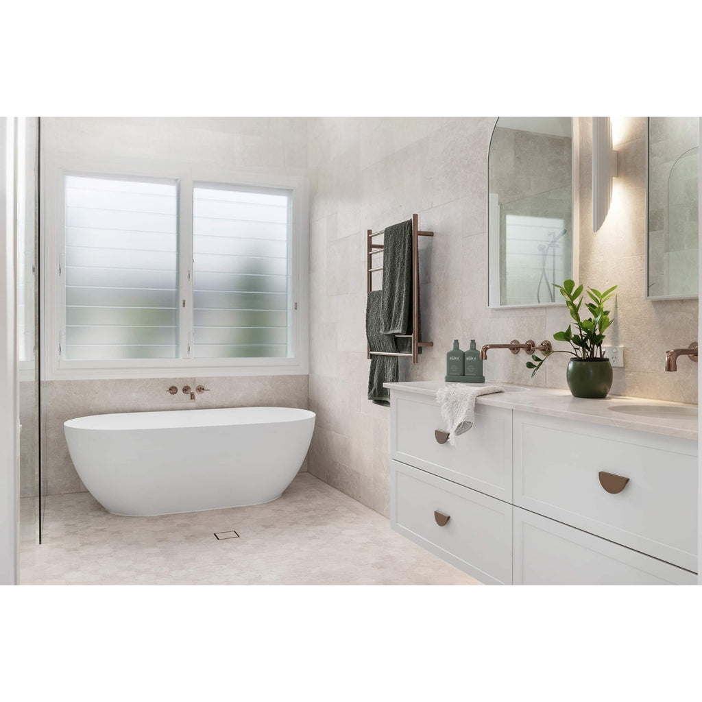 Introducing the Thermogroup Polished Rose Gold Round Heated Ladder Rail at 800mm a pinnacle of style and warmth for your bathroom. Available in Brushed Gold and Gun Metal, this rail adds elegance to your space. Backed by a reliable 7-Years Warranty, elevate your bathroom with enduring sophistication and comfort. Trust Thermogroup's commitment to quality, offering a sleek addition that seamlessly combines functionality with luxurious design, ensuring a touch of opulence in your daily routine.