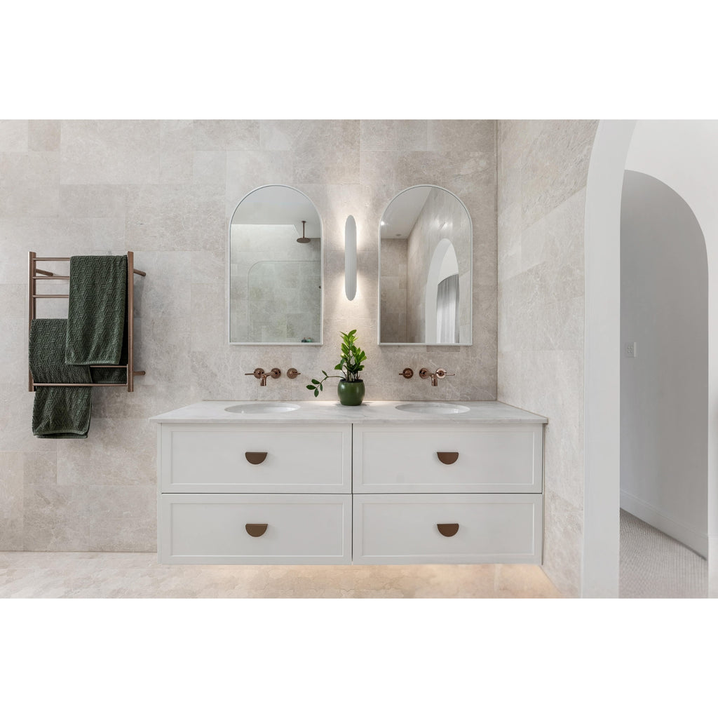 The SR44MRG Heated Towel Rail is a 600x800 7-bar polished rose gold ladder rail, perfectly sized for two towels and designed to complement rose gold bathroom fixtures. Featuring multiflex wiring, it offers versatile connection points on either side, allowing for both top and bottom configurations, and the choice between hardwired or plug-in installation. This electric rail heats quickly to 45-55 degrees, and with its energy efficiency, it can operate for as little as $1 a week. A Timer is recommended for optimal cost control.