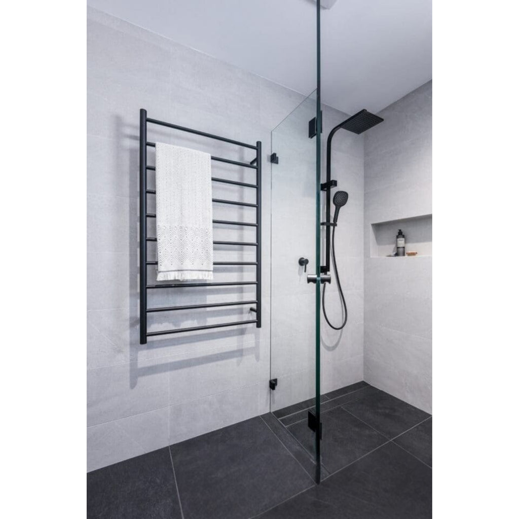 Transform your bathroom into a haven of luxury and warmth with the Matte Black Heated Ladder Rail. With a generous 1200mm size, this 10-bar rail accommodates three to four towels seamlessly, harmonizing flawlessly with Matte Black tapware. Its multiflex wiring ensures versatile installations, offering options for hardwired or plugin connections on either side. Operating at 45-55 degrees, this electric towel rail provides swift warmth and can be optimized with a timer, running efficiently at just $1 a week. Backed by a reliable 7-Years Replacement Warranty.