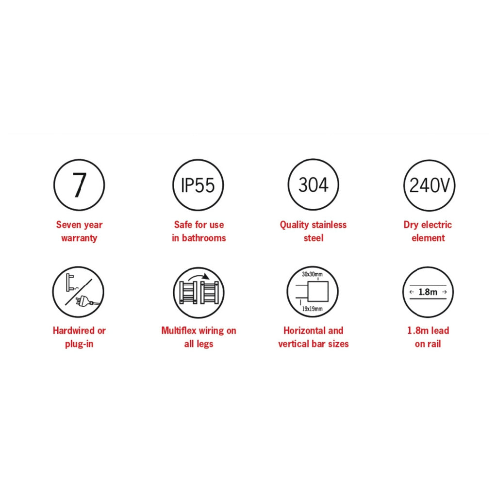 Heated Towel Rails Offer Affordable Luxury For Every Bathroom, Ensuring Towels Are Warm And Dry. The SS88MB, An 800 X 1160 10-Bar Matte Black Ladder Rail, Complements Black Tapware Beautifully. Its Size Accommodates 3-4 Towels, Perfect For Family Bathrooms. Featuring Multiflex Wiring, It Allows Flexible Installation For Hardwired Or Plugin Options On Either Side. Rapidly Heating To 45-55 Degrees, This Electric Rail Is Energy-Efficient, Costing As Little As $1 Per Week. Control Costs Effortlessly With A Recommended Timer Switch For Convenience.