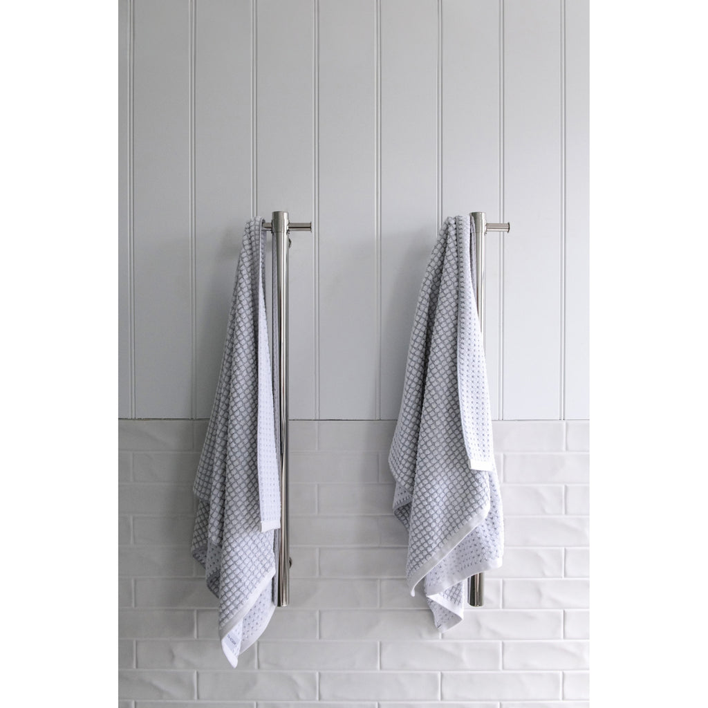 The Thermorail, an attainable luxury, efficiently dries towels and makes a bold statement in bathrooms, especially those with limited wall space. Its polished stainless finish seamlessly complements chrome tapware, adding a touch of elegance. Featuring an optional towel hook for convenience, though with slightly less surface contact than ladder rails, it ensures effective towel drying. With a secure 12-volt system and an included transformer, these single-bar rails guarantee safe installation near water, while using a recommended Timer optimizes energy efficiency, offering both convenience and cost savings.