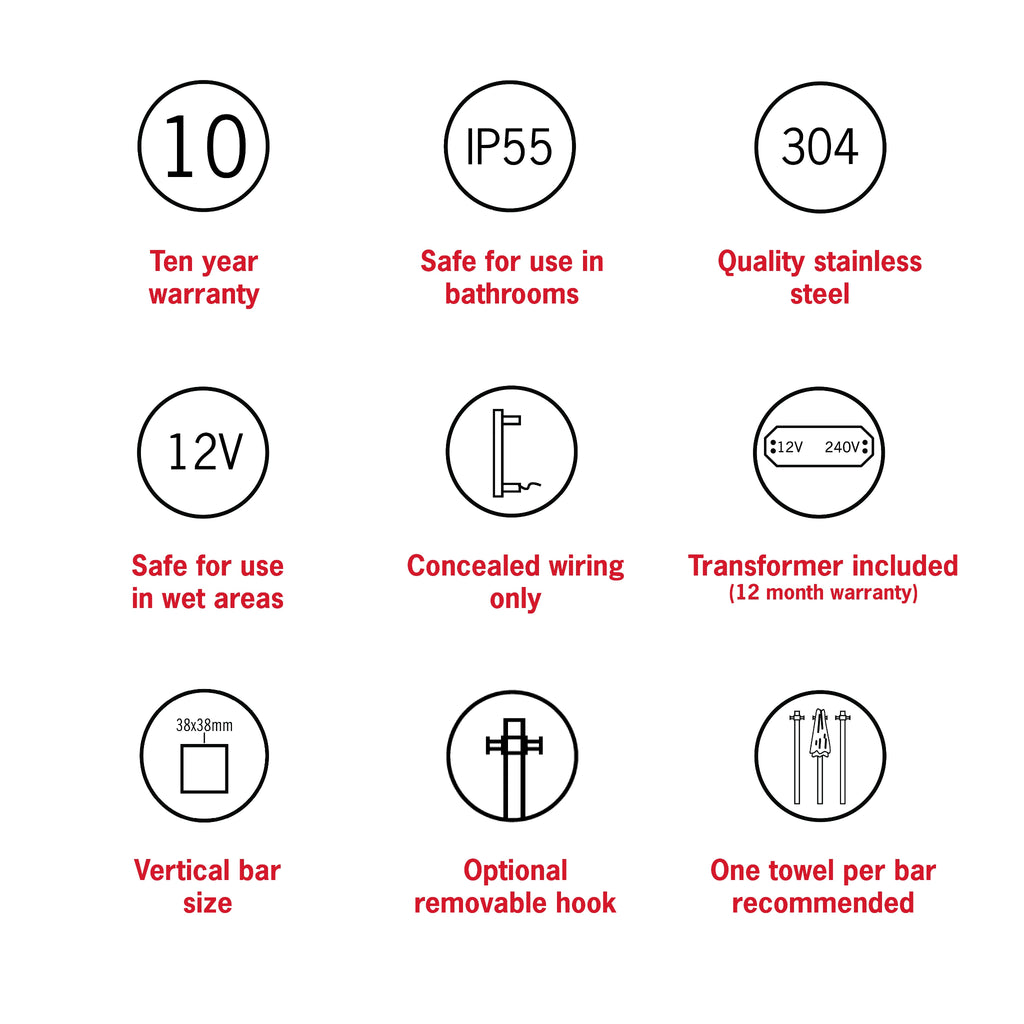 The Thermorail offers affordable luxury, efficiently drying towels while making a style statement, especially in bathrooms with limited wall space. Its polished stainless finish complements chrome tapware seamlessly, adding elegance to your bathroom decor. Featuring an optional towel hook for added convenience, this vertical rail, while slightly less effective than ladder rails due to reduced surface contact, ensures practical towel drying. With a safe 12-volt system and an included transformer, these single-bar rails allow flexible installation near water, while using a recommended Timer optimizes energy efficiency and reduces running costs.