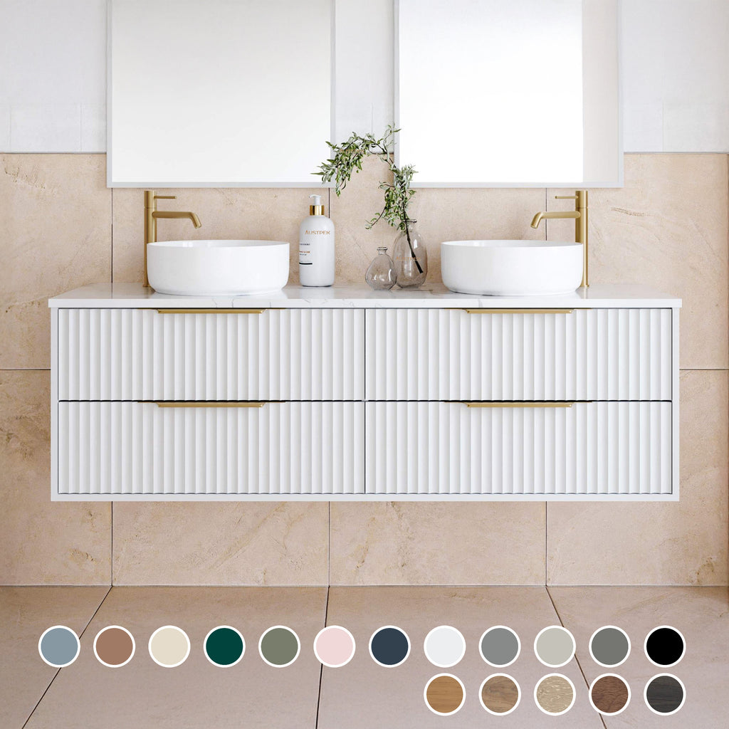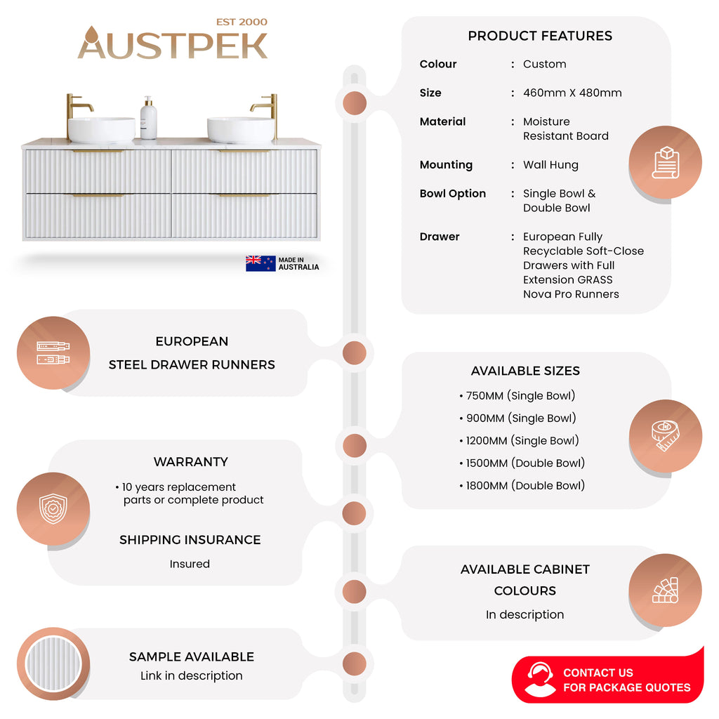 The Timberline Emmett Custom Wall Hung Vanity offers elegant and adaptable bathroom solutions. Available in sizes 750mm, 900mm, 1200mm (single bowls) and 1500mm, 1800mm (double bowls), it meets diverse layout needs. Constructed from moisture-resistant board, this vanity allows for personalised cabinet colours and handle choices. With a custom colour option and a 10-year warranty, it ensures lasting style and functionality in your bathroom design.