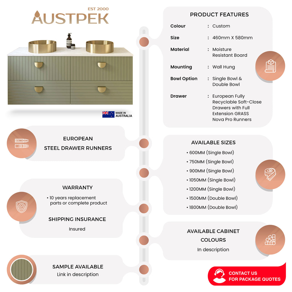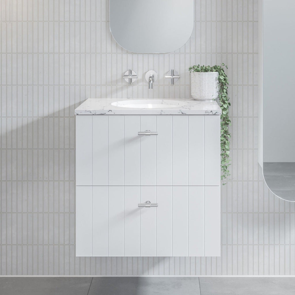 The Timberline Henley Custom Wall Hung Vanity enriches your bathroom with rich detail and texture. Available in sizes 600mm, 750mm, 900mm, 1050mm, 1200mm, 1500mm, and 1800mm, this vanity features both single and double bowl options to suit various space requirements. Crafted from moisture-resistant board and offering three distinctive 3D routing patterns, it allows full customization in cabinet colour and handle selections. Each vanity is backed by a 10-year manufacturer's warranty, promising durability and style.