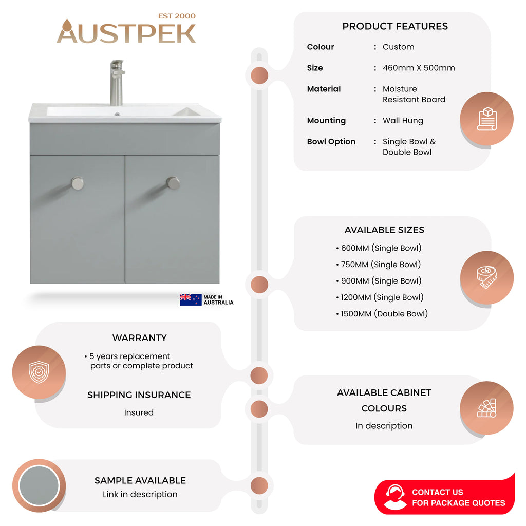 The Timberline Indiana Custom Wall Hung Vanity is crafted to enhance your bathroom with optimal storage solutions. Designed with multiple drawer heights and full depth cupboard spacing, it accommodates all your bathroom essentials efficiently. Constructed from moisture-resistant board, this vanity allows for full customisation in cabinet colour and handle selections. Available in your choice of custom colours, it comes with a 5-year manufacturer's warranty, ensuring durability and tailored elegance for your bathroom space.