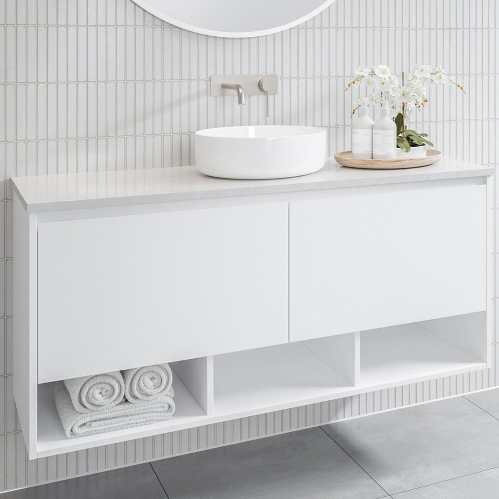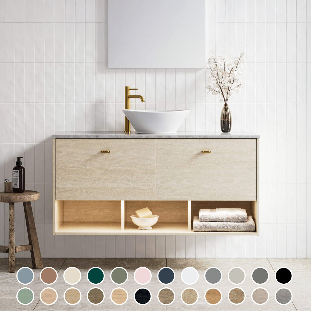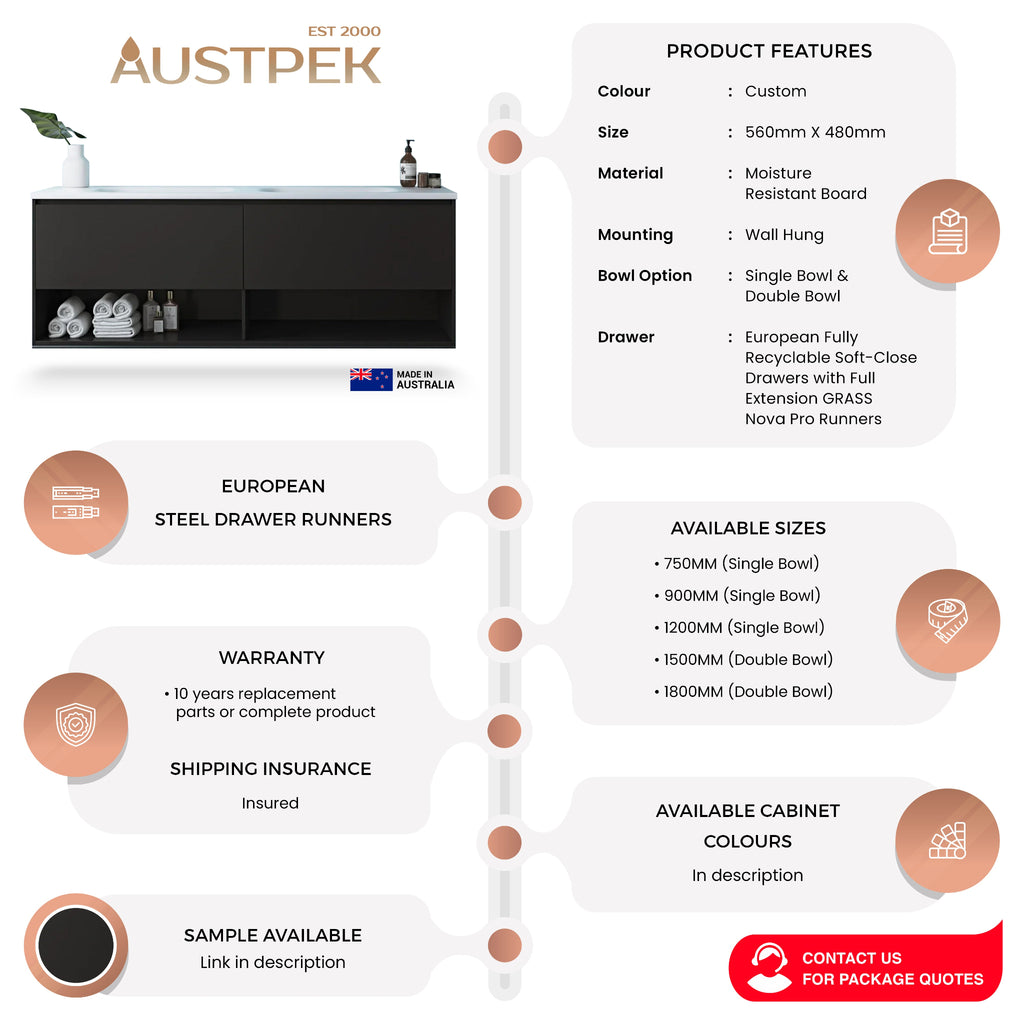 The Timberline Kansas Custom Wall Hung Vanity offers elegant and adaptable bathroom solutions. Available in sizes 600mm, 750mm, 900mm,1200mm, 1500mm and 1800mm, it meets diverse layout needs. Constructed from moisture-resistant board, this vanity allows for personalised cabinet colours and handle choices. With a custom colour option and a 10-year warranty, it ensures lasting style and functionality in your bathroom design.