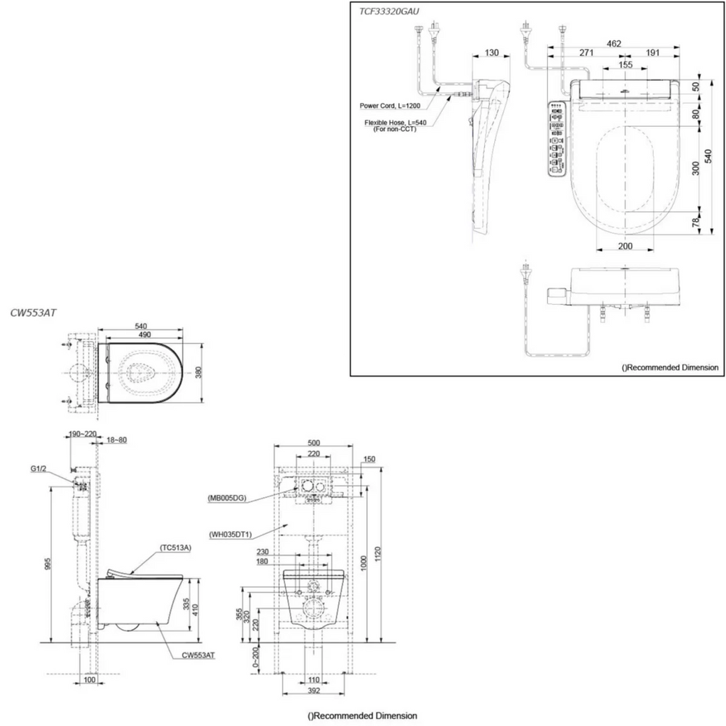 PART 1) CW553AT - TOTO D-Shape Wall Hung Closet Bowl P-Trap w/o Concealed Washlet Connection Rough-in 220