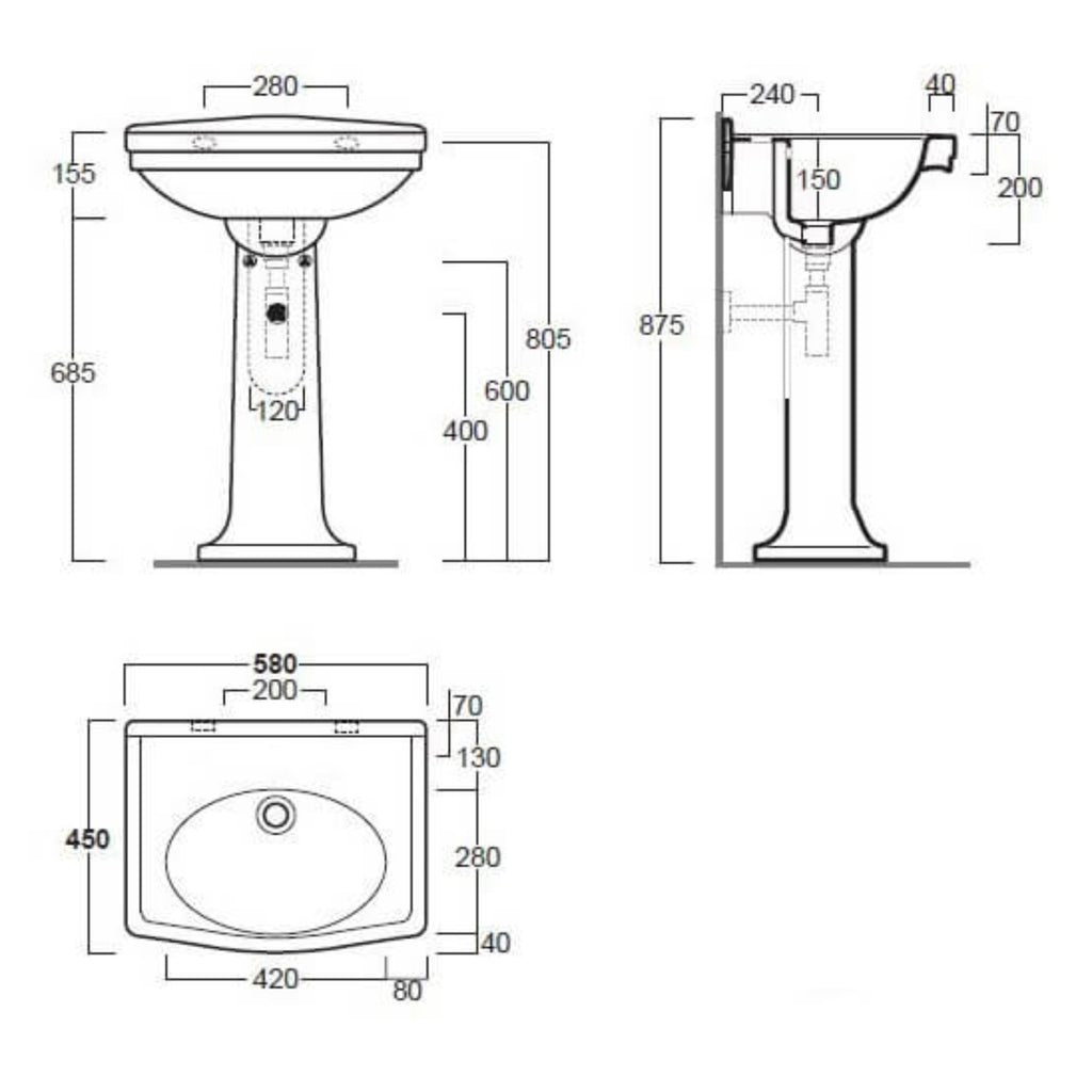 TURNER HASTINGS CLAREMONT NO TAPHOLE BASIN & PEDESTAL GLOSS WHITE 580MM X 875MM