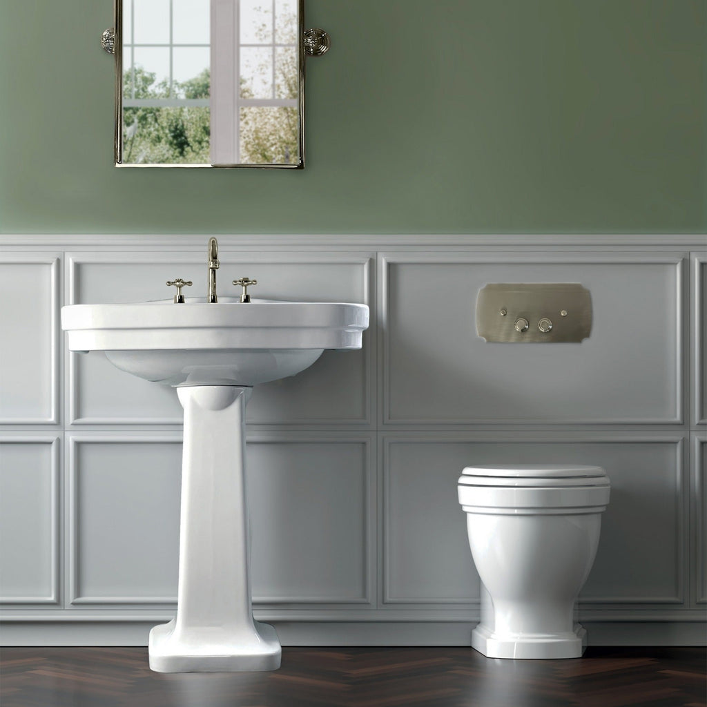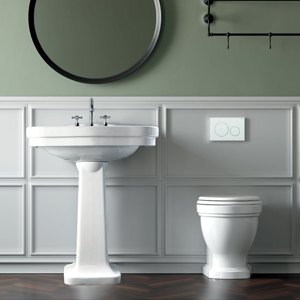 The Turner Hastings Claremont Wall Faced Pan with Chrome Hinges in Gloss White, handcrafted in Italy, embodies sophistication for heritage or traditional style bathrooms and ensuites. Designed for compatibility with Geberit's frameless in-wall cisterns and a variety of flush plates, it enhances any bathroom's aesthetic. This versatile pan accommodates most in-wall cisterns available in Australia. Turner Hastings offers a 12-year warranty on the ceramic and a 1-year warranty on the seat, ensuring lasting quality and elegance.