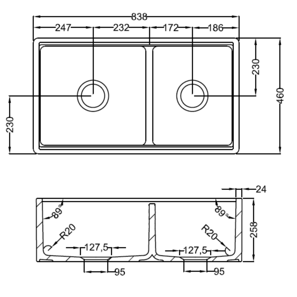 TURNER HASTINGS COVE FIRECLAY DOUBLE BOWL BUTLER SINK GLOSS WHITE 838MM