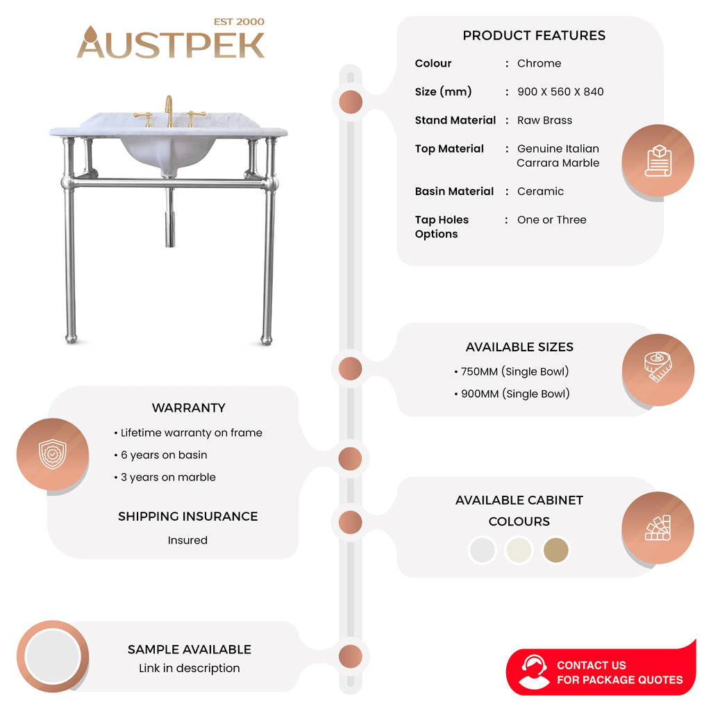 TURNER HASTINGS MAYER BASIN STAND WITH REAL CARRARA MARBLE TOP CHROME 900MM
