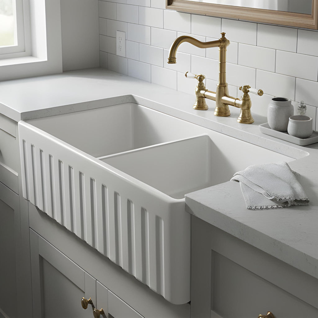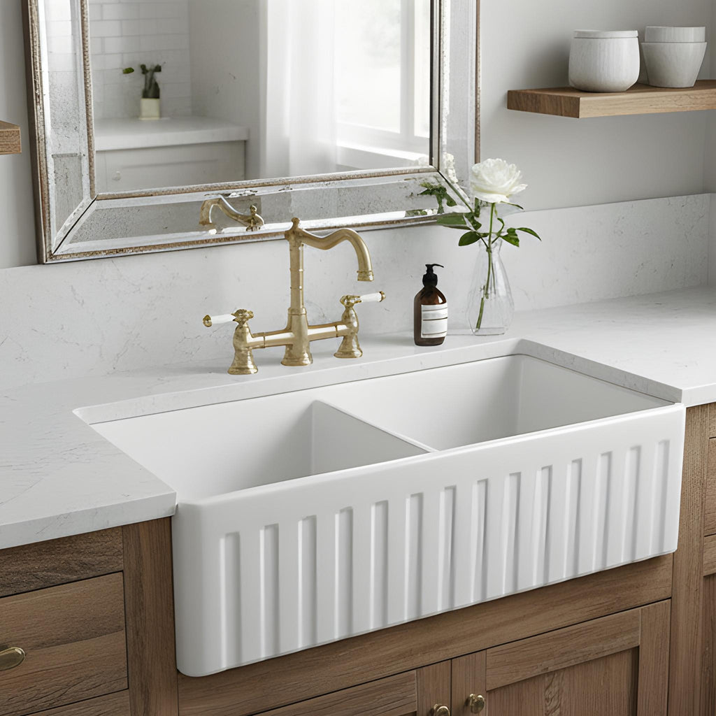 The Turner Hastings Novi Fireclay Double Bowl Farmhouse Butler Sink 840mm in Matte White combines timeless design with exceptional durability. Crafted from premium fine fireclay, it offers outstanding resistance to stains, scratches, and chemicals. This reversible sink—flat or ribbed side facing out—supports multiple installation styles: butler, counter top, or under counter. Suitable for food waste disposers, it includes 90x50mm stainless steel basket wastes. As a natural material, fireclay may vary. Backed by a lifetime warranty, it ensures enduring performance.