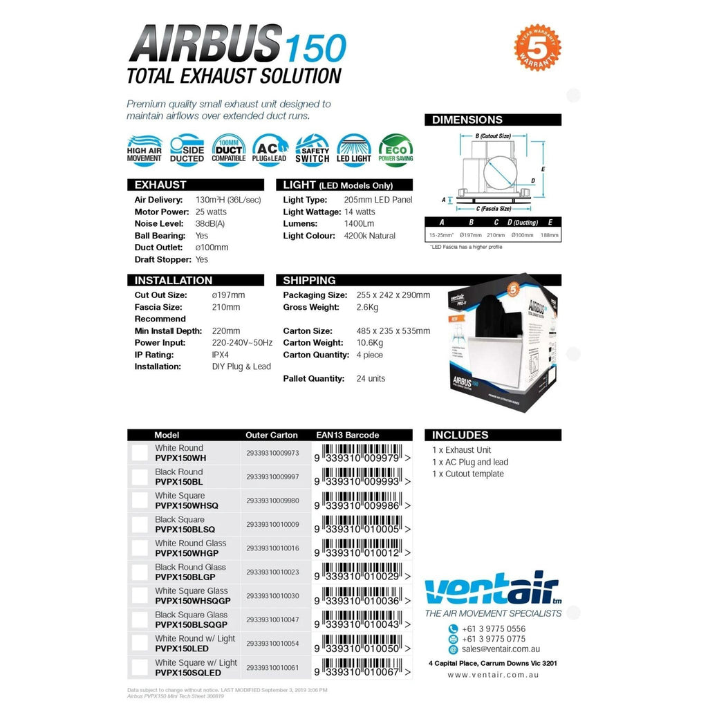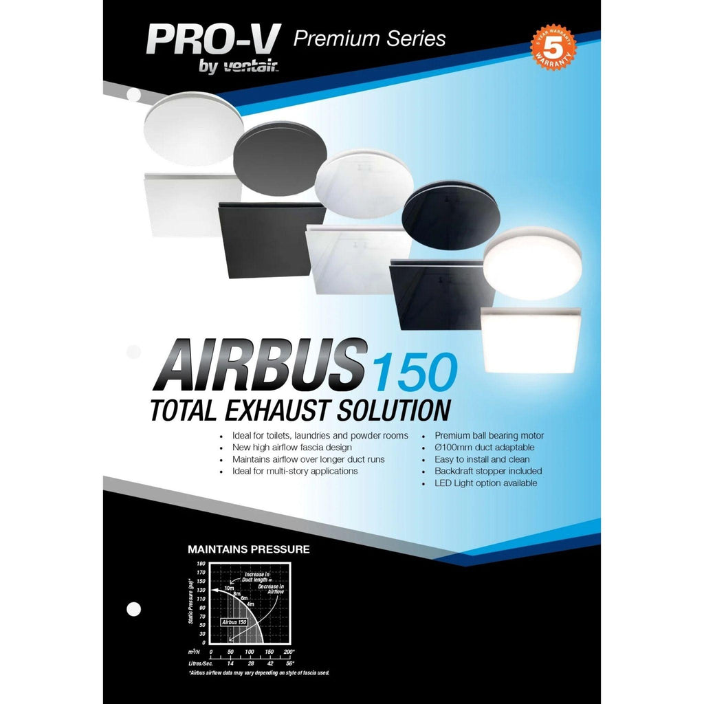 VENTAIR AIRBUS 150 SQUARE PREMIUM QUALITY SIDE DUCTED EXHAUST FAN WITH 10W LED PANEL WHITE